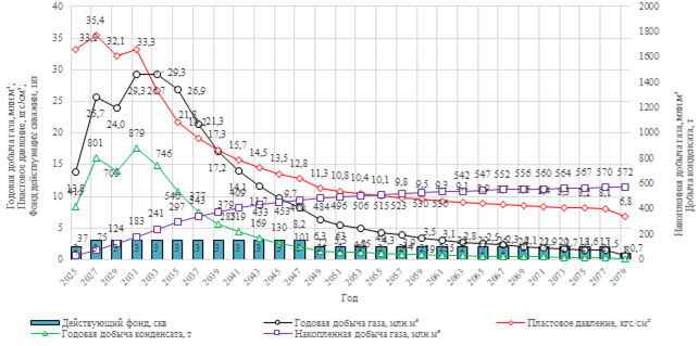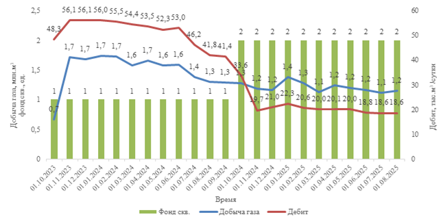В 2025 году по состоянию на конец III квартала добыто 10,5 млн м³ газа при действующем фонде из двух скважин со средним дебитом 20,0 тыс. м³/сутки и депрессией на пласт 327,0 кгс/см². По состоянию на 01.10.2025 г. суммарная добыча с начала разработки составила 33,4 млн м³ газа. Динамика добычи представлена на рисунке 1.