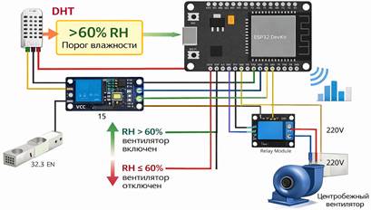 Алгоритм управления процессом сушки реализован на базе микроконтроллера ESP32 с использованием данных цифрового датчика температуры и относительной влажности DHT, а также исполнительного релейного модуля, управляющего работой центробежного вентилятора (рис. 2).