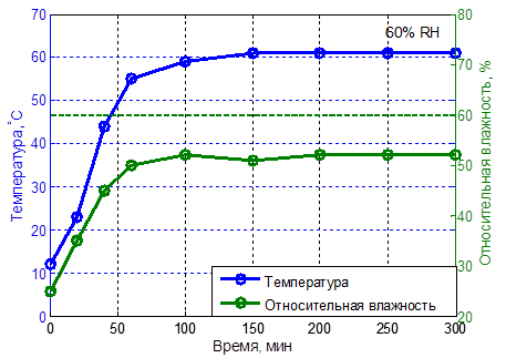 На рис. 3 представлены экспериментальные зависимости изменения температуры и относительной влажности воздуха в сушильной камере в процессе сушки лекарственных растений при использовании IoT-системы управления.