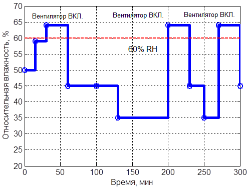 Рисунок 5. Диаграмма работы вентилятора в зависимости от относительной влажности воздуха в сушильной камере