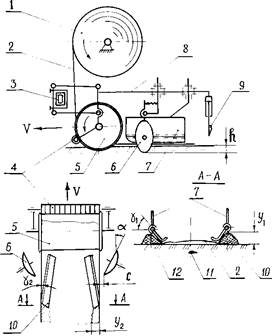 Следом идущие рабочие органы (сферические диски) насыпают с каждого края пленки рыхлый слой почвы (12). Пластинчатые щитки предотвращают попадание почвы на поверхность пленки при работе сферических дисков. В нижней части щитки имеют шарнирно соединенные крылья (10), установленные под углом в пределах 30–40° и направленные внутрь рядка. Продольная плоскость каждого щитка расположена под углом в пределах 10–15°. На краю гона тракторист с помощью ножа, управляемого гидроцилиндром, отрезает пленку [8; 9; 10; 11].
