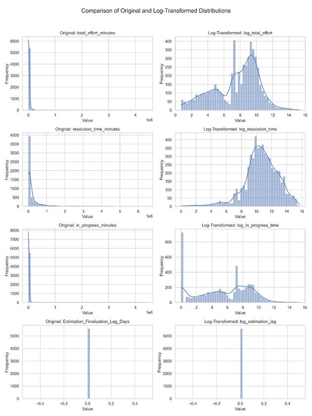 Specifically, total_effort_minutes, resolution_time_minutes, in_progress_minutes, and Estimation_Finalization_Lag_Days were transformed using the natural logarithm of one plus the variable value (np.log1p).