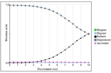На основе расчётов была построена зависимость долей фаз от расстояния до закалённого торца (0–10 см), что продемонстрированно на рисунке 1 по оси Х, а по оси Y отложены фазовые доли.