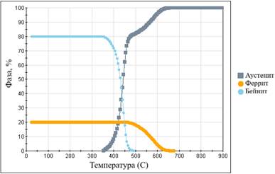 Данный расчет выполнен при размере аустенитного зерна 9 ASTM и заданному химическому составу рассматриваемой среднеуглеродистой стали 34ХН3МА, что привело к распределенным фазам.