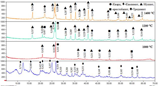 На рентгенограмме, полученной после обжига при 1000°C, каолинит отсутствует, и в основном формируется кристаллическая фаза, относящаяся к минералу муллит. Муллит (3Al₂O₃·2SiO₂) d = 0,420; 0,335; 0,243; 0,211; 0,153 нм. В исходном образце каолина основные пики соответствовали минералу кварц, и произошло превращение β-кварца в α-кварц. α-Кварц (SiO₂) d = 0,333; 0,222; 0,137 нм. На рентгенограмме, полученной после обжига при 1200°C, минералогический состав изменился следующим образом: муллит d = 0,537; 0,424; 0,346; 0,342; 0,288; 0,254; 0,242; 0,229; 0,220; 0,169; 0,160; 0,152; 0,144 нм; наблюдалось превращение α-кварца в α-тридимит. α-Тридимит (SiO₂) d = 0,407; 0,334; 0,081; 0,212 нм. На рентгенограмме, полученной после обжига при 1400°C, наблюдалось появление в основном дифракционных максимумов, относящихся к минералу муллит. Муллит d = 0,534; 0,342; 0,287; 0,253; 0,220; 0,211; 0,188; 0,183; 0,169; 0,160; 0,152; 0,144 нм; наблюдалось превращение α-тридимита в кристобалит. Кристобалит d = 0,405 нм.