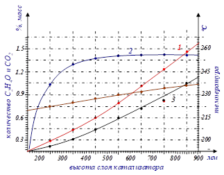Сравнивая результаты, полученные на пилотной установке (рис.6), результаты экспериментов промышленных и испытательных катализаторов показывают, что соответствие зависимостей экспериментальных (точечных) и промышленно рассчитанных (линейных) концентрационных и температурных факторов показывает, что полученный состав катализатора не уступает промышленному катализатору.