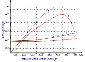 На рис.7 показаны изменения температуры газа и теплоносителя по высоте слоя катализатора, промышленный катализатор (1, 2) и испытуемый образец (3, 4). Определение оптимальных параметров процесса заключалось в определении концентраций этилена и кислорода, объема подачи газовой смеси в центр трубы, диаметра труб реактора и длины слоя катализатора.