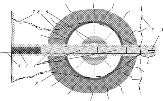 1 – патроны ВВ; 2 – забойка шпура; 3 – детонатор; 4 – провод или СИНВ для соединения детонаторов; 5 – линия отрыва породы при взрыве группы шпуров в забое выработки; 6 – центр взрыва с расходящимися от центра зонами раздробленной и разбитой трещинами породы; 7 – линия отрыва породы; 8 – линия разрушенной породы в случае взрывания одного заряда; lc – длина «стакана»