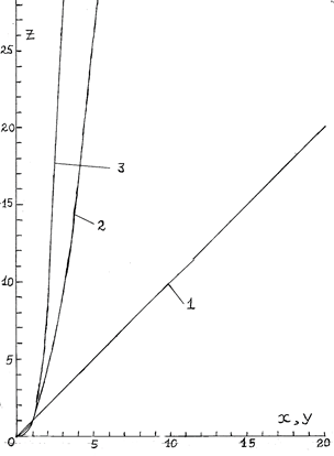 will be designed on the OZ axis. Then on the coordinate axis OY itself (at the projected points) you can see that it is really 16+9 = 25. The fact that equation (1) is not satisfied for all integer values of x, y, z and starting from k ≥ 3 seems obvious from the consideration of these graphs. Mentioned above. On line 3, for the same values X (3, 4, 5), we get the corresponding values Z: 27, 64 and 125. Hence we see that yes, indeed, starting with k = 3 Fermat's theorem is true. On the other hand, this graphic illustration shows that this mathematical process can be viewed from a new point of view. Namely, at k ≥ 3, the scale of the nonlinear maps (display) is curved