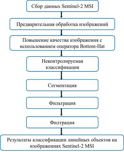 Рисунок 1. Схема алгоритма извлечения линейных объектов из изображений Sentinel-2 MSI