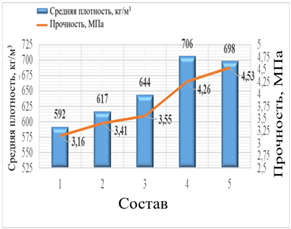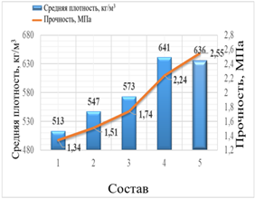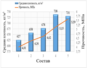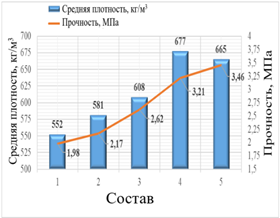 Рисунок 1. Динамика изменения средней плотности (кг/м3) и прочности (МПа) легких бетонов, изготовленных с добавкой 250 кг портландцемента в состав искусственной пористой заполнительной фракции |
