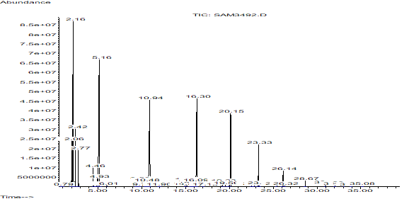 В газохимическом комплексе Устюрт (Республика Каракалпакстан) полимеризация полиэтилена и полипропилена проводится в среде гексанового раствора с использованием катализатора Сиглера–Натты. В этом процессе, помимо основного полимерного продукта, образуется жидкое вторичное сырьё. Остаточный продукт представляет собой олигомер использованных мономеров, основная часть которого — парафины с числом атомов углерода от C6 до C20; качественный и количественный состав этих компонентов был определён методом хроматографии (рис. 1). Хроматографический анализ показал, что структура использованного гексана в основном представлена насыщенными углеводородами нормальной структуры фракции C14–C18.