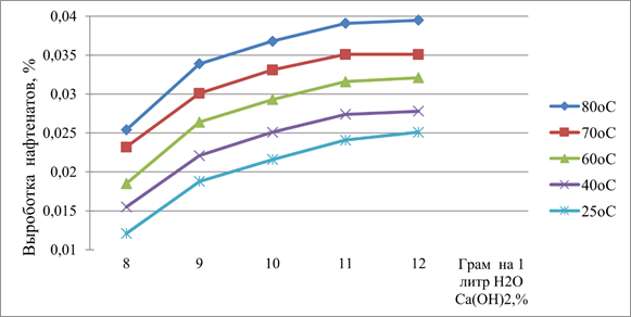 Рисунок 2. Выход нафтенатов при омылении гидроксидом кальция, при различных температурах для нефти месторождения Караул базар с КЧ 3,74мг КОН/г на нефть