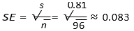 Beyond mean rating, it is useful to estimate uncertainty of the survey mean. Using the estimated standard deviation s = 0.81 and sample size n = 96, the standard error of the mean is: