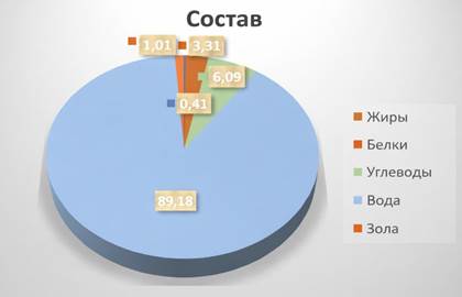 В составе вешенки в основном содержится 89 г воды, 2,3 г пищевых волокон и 1,01 г зольных веществ. Также присутствуют 3,3 г белка, 0,4 г жиров и 3,8 г углеводов. [2] Химический состав также богат: в нём содержится множество макро- и микроэлементов, в частности, в 100 г продукта их количество составляет следующие значения.