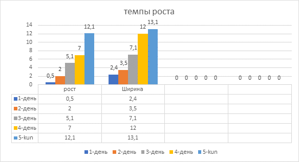 Эти мешки хранились в тёмном помещении при средней температуре 15ºC и влажности 80–90%. Создание достаточной влажности и температуры, а также высокое качество питательной среды позволили мицелию покрыть стенки мешка за 16 дней. Начиная с 22-го дня увеличивающиеся в размерах грибы можно было увидеть невооружённым глазом. После этого в течение 5 дней проводились измерительные работы, и были зафиксированы следующие результаты (рисунок 3).