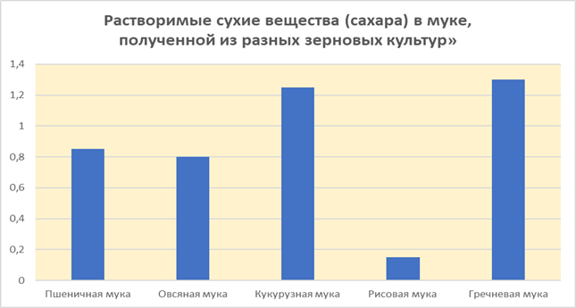 В муке из пшеницы и овса содержание растворимых сухих веществ (сахаров) было средним — 0,85 % и 0,8 % соответственно.