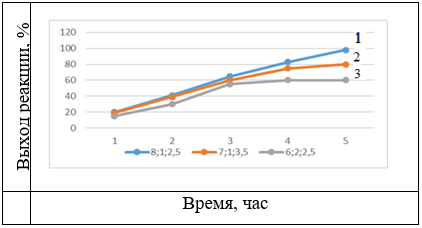 Как видно из рисунка 1, наибольшая рентабельность по сравнению с другими достигается при соотношении эфира аллилглицида, акриловой кислоты и НПЭГ-2400 8:1:2,5. Процесс синтеза длится 5 часов. При продолжительности процесса синтеза более 5 часов наблюдается снижение выхода суперпластификатора. Это можно объяснить тем, что вещества, используемые в качестве сырья, находятся в различных агрегатных состояниях в течение более 5 часов. Поскольку наличие взаимодействующих веществ в двух разных агрегатных состояниях уменьшает их взаимодействие.