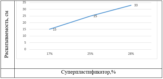 Как видно из приведенной выше диаграммы на рисунке 3, количество образующейся концентрации суперпластификатора существенно влияет на текучесть цементного раствора. Суперпластификатор использовали в количестве от 15% до 30% от массы. Полученные результаты показали, что при использовании суперпластификатора в виде 30% раствора пластифицирующие свойства показали самый высокий результат, а растекаемость цементного раствора составила 33 см. При добавлении 25%-ной добавки суперпластификатора в цементное тесто текучесть составила 26 см, а при добавлении 17%-ного суперпластификатора в цементное тесто проявила самые низкие пластифицирующие свойства, текучесть составила 15 см. Из этого видно, что при добавлении 30%-ного раствора синтезированного нами суперпластификатора получается суперпластификатор с наибольшими пластифицирующими свойствами.
