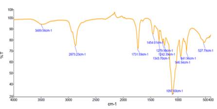 В ИК-спектре поликарбоксилатного суперпластификатора, синтезированного на основе аллилглицидилового эфира и НПЭГ-2400, широкая полоса поглощения около 3489,56 см-1 соответствует валентным колебаниям гидроксильных (-OH) групп, присутствующих в полимерной цепи. Поглощение в области 2873,23 см−1 указывает на наличие валентных колебаний алифатических групп CH2-CH3. В области 1731,59 см-1 можно наблюдать характерные полосы, соответствующие карбонильной (C=O) и карбоксильной (COOH) группам. Группы в области 1279,99 см-1 и 1242,39 см-1 соответствуют валентным колебаниям сложноэфирных связей C-O-C. Это указывает на наличие полиэфирных цепей в полимере и включение аллилглицидилового эфира в полимер. Сильное поглощение, наблюдаемое в области 1097,60 см-1, связано с валентными колебаниями связей C-O, что подтверждает наличие полиэфирных боковых цепей, характерных для поликарбоксилатных суперпластификаторов.
