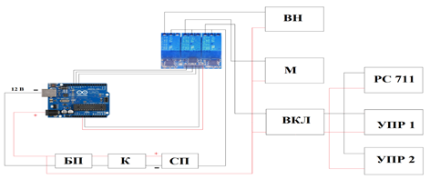 Таким образом, технические характеристики УО удовлетворяют требованиям надёжности также эффективности: она не габаритная, т.е. лёгкая, экономичная и долговечная (около 10 лет). На рис.2 приведена принципиальная схема мехатронной системы [9]. Из рис.2, что принципиальная схема состоит из платы ARDUINO UNO, трёх канального модуля реле, контроллера заряда (К), блока питания (БП), водяного насоса (ВН), мотора (М), низковольтного выключателя (ВКЛ), реле РС 711, универсальных 5-ти контактных реле (УПР1, УПР2) [2, 8-9].