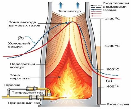 В традиционных пиролизных установках значительная часть тепловой энергии теряется с отходящими дымовыми газами и через теплопередачу в окружающую среду. Предлагаемый подход основан на замкнутом тепловом контуре, при котором избыточное тепло высокотемпературных зон печи используется для предварительного подогрева воздуха, подаваемого в зону горения и реакции.