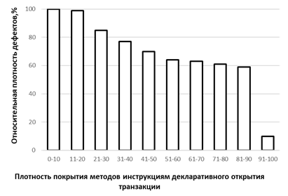Анализ эмпирических данных, представленных на рис. 1, демонстрирует наличие нелинейной зависимости между плотностью расстановки инструкций управления транзакциями и показателем Defect Density. При низкой доле методов, покрытых транзакционными инструкциями, увеличение их количества сопровождается снижением значения DD. Однако дальнейшее увеличение плотности транзакционной разметки не приводит к пропорциональному улучшению показателя и в ряде случаев сопровождается его стабилизацией либо ростом.