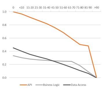 Дополнительно была проведена стратификация данных по архитектурным слоям (API, Business Logic, Data Access), что позволило построить отдельные зависимости показателя DD от доли методов, покрытых инструкциями управления транзакциями, для каждого слоя. Результирующие зависимости представлены на рис. 2.