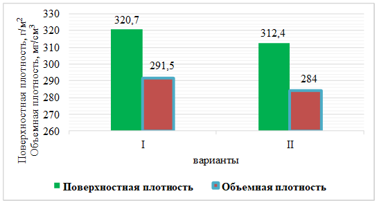 Рисунок 1. Гистограмма изменения поверхностной и объемной плотности хлопко-шелковых рисунчатых трикотажных полотен
