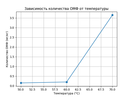 Результаты показывают, что при температурах 50–60 °C количество ОМФ остаётся на низком уровне, тогда как при 70 °C наблюдается резкое увеличение.