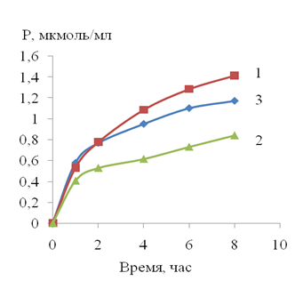 В качестве протеиназ использовали протеиназа солода и микробиальные кислые и и нейтральной протеиназой. Из представленных данных видно, что в зависимости от источника фермента, скорость гидролиза белков различна. С помощью протеиназ солода белки наиболее высокой скоростью подвергается ферментативному гидролизу, (рис.1, кривые 1). При 6 часовой ферментации в указанных условия образование продуктов гидролиза из щелочерастворимых белков составляло 1,4 мкмоль/мл. В случае, когда использовали кислой протеиназы 0,8 мкмоль/мл и 1,1 мкмоль/мл в случае использование нейтральной протеиназы. Таким образом, гидролиз белков топинамбура наиболее высокой скоростью гидролизуется протеиназами солода.