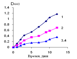 1- контроль; 2- в присутствии пептидов полученных с кислой протеиназой; 3- пептиды, полученные с нейтральной протеиназой; 4- пептиды, полученные с ферментами солода.