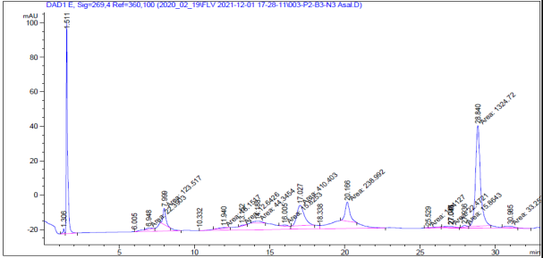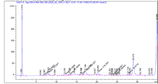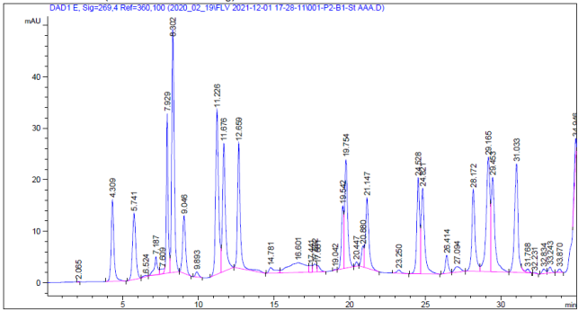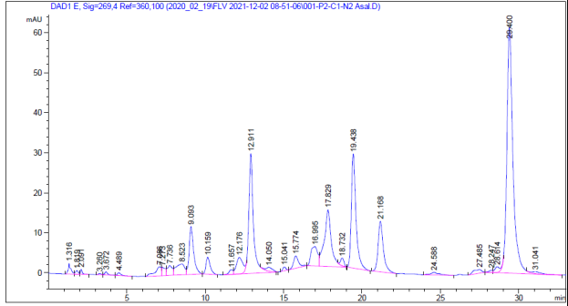 Хроматограмма образца №1 показывает высокое содержание фенилаланина из всех аминокислот, который определятся на 29 минуте, а содержание пролина в этом образце по расчетам составляет 0,023424 мг/г, пик которого можно увидеть на 14.41 минуте. Отсутствуют цистеин, треонин, аргенин, метионин.