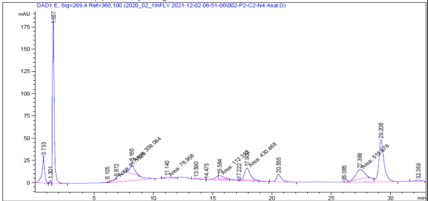 Идентификацию ФТК-аминокислот провели на хроматографе Agilent Technologies 1200 на колонке 75x4.6 mm Discovery HS C18. Раствор А: 0,14М CН3СOONa + 0,05% ТЭА рН 6,4, В:CH3CN. Скорость потока 1,2 мл/мин, поглощение 269нм. Градиент %B/мин: 1-6%/0-2.5мин; 6-30%/2.51-40мин; 30-60%/40,1-45мин; 60-60%/45,1-50мин; 60-0%/50,1-55мин