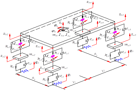 Для точного анализа вертикальных колебаний, продольной и поперечной качки электрического внедорожника (SUV) разработана пространственная динамическая модель (полная модель автомобиля) с семью степенями свободы (7-DOF). Подрессоренная масса (кузов автомобиля) рассматривается как абсолютно твердое тело, при этом деформации изгиба и кручения не учитываются. Кузов имеет 3 степени свободы: вертикальное перемещение центра тяжести (z), угол продольной качки (j — тангаж) и угол поперечной качки (q — крен). Неподрессоренная масса (мосты, колеса) состоит из 4 независимых масс (mwi, где i=1¸4), каждая из которых имеет одну степень свободы — вертикальное перемещение (zbi) (Рис. 1).