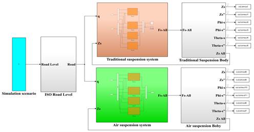 Общая имитационная схема системы подвески с семью степенями свободы для двух конфигураций — традиционной и пневматической — представлена на рисунке 2.