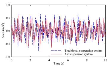 Результаты моделирования при движении по случайным микропрофилям дороги категории B согласно ISO 8608 на скорости 20 м/с показывают, что пневматическая подвеска значительно улучшает все три основных показателя колебаний. Вертикальное ускорение — ключевой показатель плавности хода по стандарту ISO 2631-1 — было существенно оптимизировано. Временные характеристики на Рис. 3 демонстрируют, что пневматическая подвеска (красная линия) поддерживает более узкую и стабильную амплитуду по сравнению с традиционной системой (синяя пунктирная линия), эффективно подавляя пиковые импульсные силы, превышающие порог 0,5 м/с².