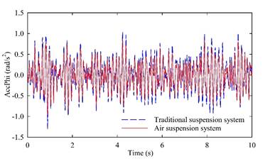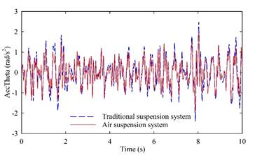 Анализ графиков углового ускорения продольной качки (тангажа) в течение 10 секунд при движении по дороге категории B согласно ISO 8608 (Рис. 4) показывает, что пневматическая подвеска (красная линия) обеспечивает превосходный контроль амплитуды по сравнению с традиционной системой (синяя пунктирная линия). Пиковые значения колебаний при использовании пневмопружин в основном ограничены пределом 0,5 рад/с², в то время как традиционная система часто достигает порога 1,0 рад/с². Тот факт, что кривая графика плотно прилегает к нулевой оси, свидетельствует о лучшем динамическом равновесии, минимизации продольной раскачки и повышении комфорта пассажиров. В количественном выражении среднеквадратичное значение (RMS) снизилось с 0,3856 рад/с² до 0,3134 рад/с², что соответствует впечатляющему улучшению на 18,73% (Таблица 4).