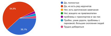 Для большинства опрошенных (92,9%) исторический центр города привлекателен для работы и учебы, однако многие из них отмечают ряд недочетов (54,8%), которые преимущественно связаны с транспортной доступностью, шириной улиц и отсутствием достаточного количества парковочных мест (Рисунок 1). Также был задан вопрос о привлекательности исторического центра города как места для проведения образовательных мероприятий, согласно ответам на который складывается схожая ситуация, что и в первом вопросе, однако, для большинства (57,1%) проблема транспортной доступности становится менее значимой. Что вероятно связано, во-первых, с частотой посещения образовательных мероприятий, а во-вторых, со временем таких поездок, не попадающих на часы пик.