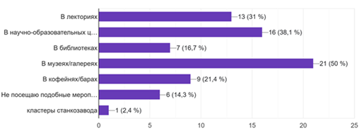 По результатам опроса большинство респондентов (71,4%) изъявили желание посетить новое место для проведения образовательных мероприятий, а часть из них и вовсе отметили нехватку таковых в городе. При этом, наиболее частыми местами для проведения образовательных мероприятий на данный момент являются музеи и галереи (50%), научно-образовательные центры (38,1%) и лектории (31%) (Рисунок 2). Также были отмечены и нетипичные места для проведения образовательных мероприятий: кафе и бары (21,4%), что, однако соответствует понятиям о многофункциональности пространств и росту их популярности. Этот важный аспект стоит отметить при разработке концепции.