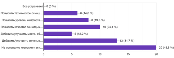 Так как, согласно определению, образовательный квартал включает в себя «содействие рабочей подготовке и обучение на рабочем месте» [2] был добавлен вопрос о коворкингах. И хотя на данном этапе большой популярностью в г. Самара они не пользуются, все же та часть респондентов, что посещают их, отметили ряд недочетов в существующих коворкингах города (14,3%). Чтобы их исправить, респонденты хотели бы: добавить зеленые зоны (31,7%), повысить качество зон отдыха (24,4%) и уровень комфорта рабочего места (19,5%).