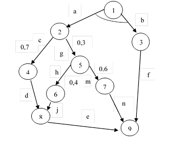 На рисунке 1 каждая вершина относится к определенному типу, вершины 2 и 5 являются дизъюнктивными, вершина 1-конъюнктивна, вершины 3,4,6,7,8 – унарны. Построенная стохастическая сеть позволяет определить альтернативные варианты реализации множества процессов (работ) без знания специальных методов расчёта. Число возможных вариантов 3: {a,b,c,d,e,f};{ a,b,g,h,j,e,f}; {a,b,g,m,n,f}. С точки зрения теории вероятностей каждый из этих вариантов сетевых графиков можно рассматривать как случайное событие [1,2].