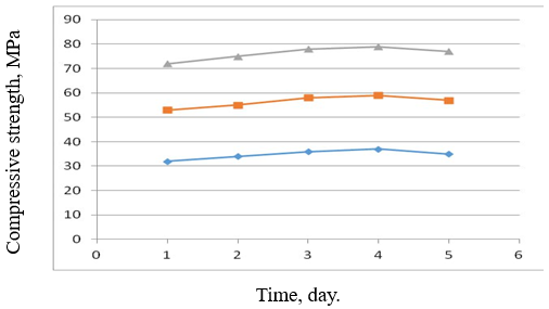 Strength of fine-grained concrete based on Portland cement of class B52,5 for 2, 7, and 28 days.