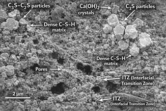 Figure 3. Microstructure of Portland cement class B52,5 in a 2-day sample.