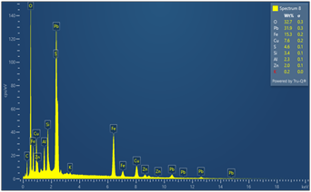 Спектр показывает следующие элементы по массовой доле (Wt%). Кислород 32,7 % — наибольшее содержание, указывает на преобладание оксидных соединений. Свинец-31,9 % очень высокое содержание, характерное для шлаков вторичной переработки свинца. Фосфор-15,3 % значительное количество, свидетельствует о наличии фосфатных соединений. Железо-7,6 %, Медь-4,6 %, Сера-3,4 %, Кремний-2,3 %, Алюминий-2,0 %, Цинк-0,2 %, Калий-0,2 %, на спектре доминируют пики свинца в областях ~2–3 кэВ, 10–12 кэВ и др., а также мощный пик кислорода (~0,5 кэВ). Это подтверждает, что шлам в основном состоит из оксидов свинца, фосфатов и соединений железа. Возможное происхождение шлама. Кроме того, анализ показывает, что в составе шлама присутствует определённое количество драгоценных металлов, а именно золота (Au) и серебра (Ag).