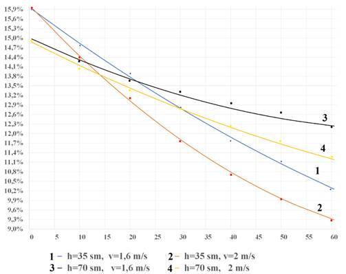 Заключение. Охлаждение хлопкового сырья в фермерских хозяйствах методом активного вентилирования до достижения нормативного уровня влажности является наиболее эффективным способом сохранения качества продукции. Время охлаждения и темп распределения тепла, определенные с помощью математической модели, позволяют устанавливать энергосберегающие режимы охлаждения как в фермерских хозяйствах, так и на промышленных предприятиях. Сравнительный анализ показывает, что расхождение (погрешность) между расчетными и экспериментальными данными не превышает 4-5%. Это позволяет на основе предложенного алгоритма решения проводить комплексный анализ интенсивности вентилирования в компактном виде [8, 9].