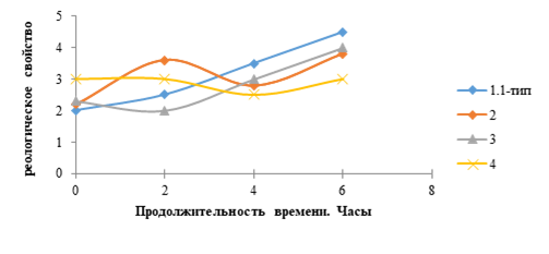 Результаты исследования. На рисунке 1 ниже видна зависимость реологических свойств глинистых порошков от продолжительности времени в процессе модификации.