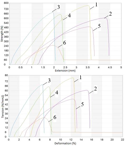 These studies were carried out on a SHIMADZU AGS-X tensile testing machine. Rectangular plates, each 7 cm in length and 1 cm in width, were cut from the special coatings as test samples and subjected to uniaxial tensile testing using a standard method. Based on the results obtained, the stress-strain and force-elongation parameters of the samples were determined, and their physical-mechanical properties were evaluated (Figure 2).