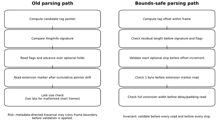 Figure 1. Vulnerable metadata-directed traversal versus bounds-safe offset-based parsing of Xing/Info VBR metadata