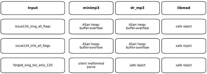 Figure 3. Outcomes for targeted forged Xing/Info metadata cases under AddressSanitizer across minimp3, dr_mp3, and libmad